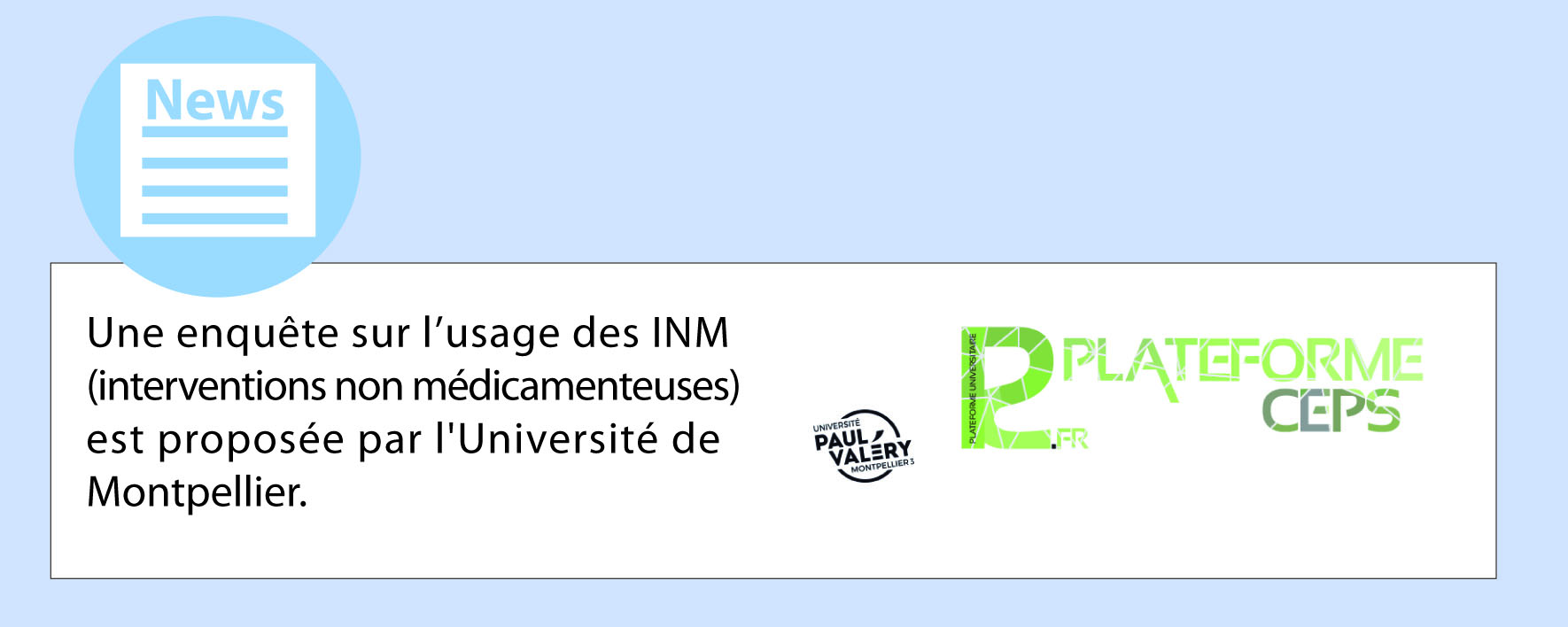 Cette enquête s’adresse aux professionnels de santé et au grand public. Elle s’intéresse aux usages des interventions non médicamenteuses (INM), solutions souvent appelées par les médias francophones « les médecines complémentaires » ou les « médecines douces ». Elle ne vous prendra que 5 minutes. Elle est pilotée par la Plateforme universitaire CEPS en...